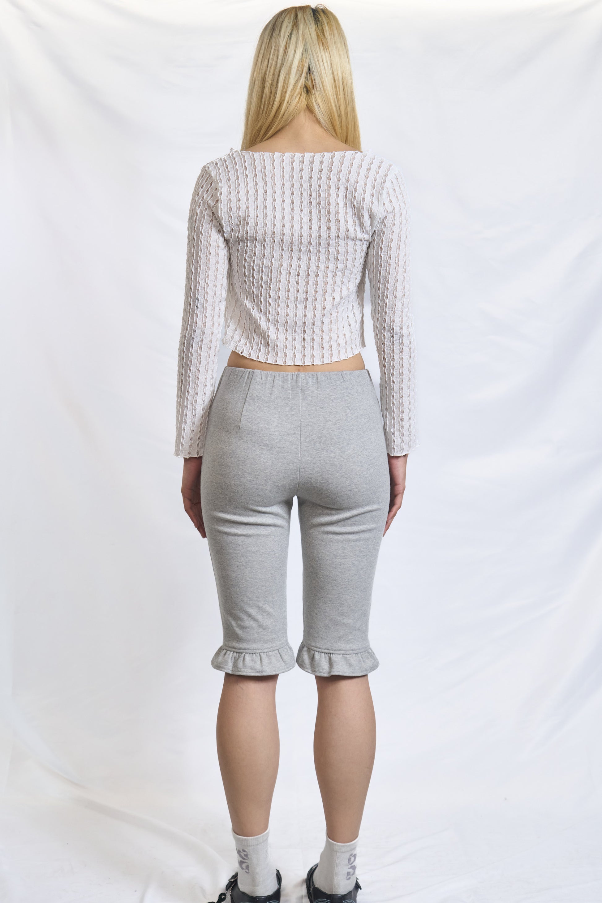 Delicate texture, undone charm. This semi-sheer top is made from a lightweight lace-knit fabric with vertical stretch ribbing and raw edges. It features two tie-front closures, offering an airy, adjustable fit. Softly cropped and easy to layer — it brings a romantic edge to your casual wardrobe.