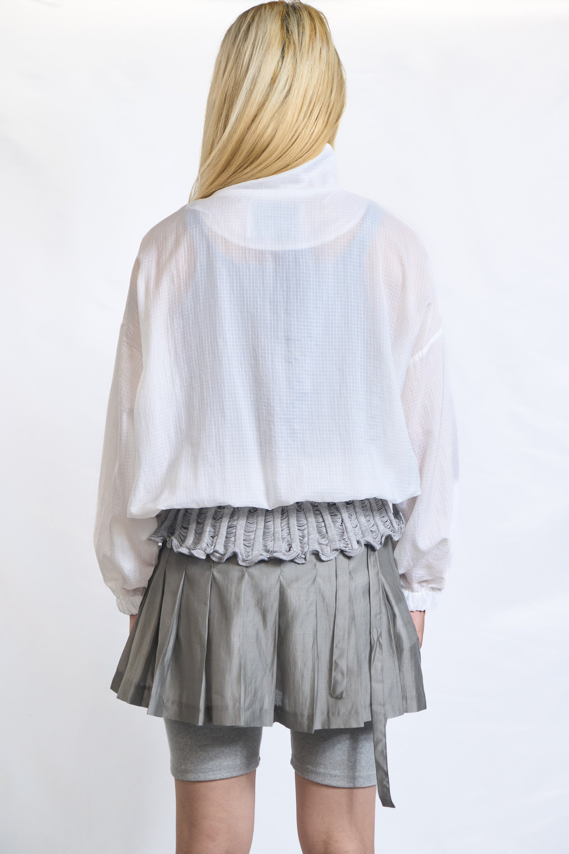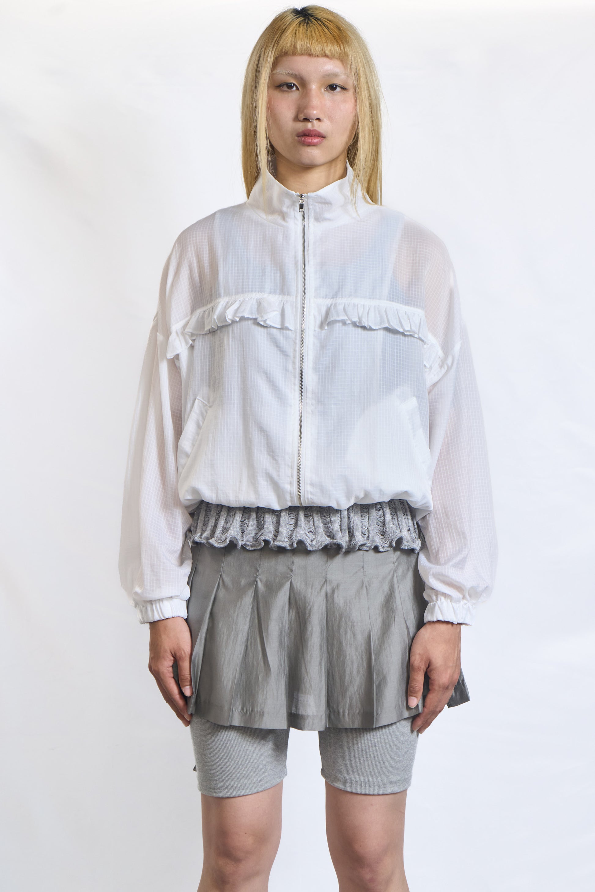 Lightweight and quietly playful. This sheer zip-up blouson is cut from a soft-textured, semi-transparent fabric with subtle check embossing. A delicate ruffle panel runs across the chest, softening the structured zip-up shape. Layer it over volume or contrast pieces to highlight its airy nature. Seersucker-style fabric with fine texture