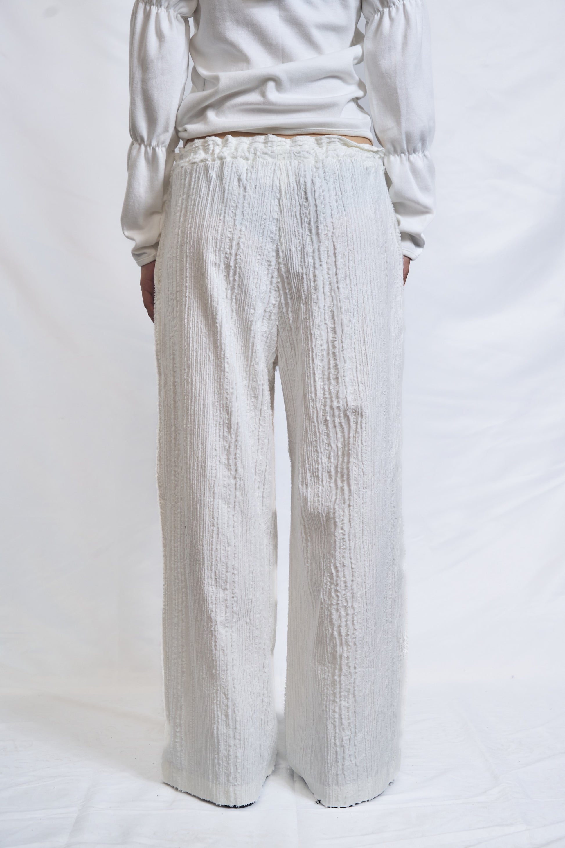 Soft volume with subtle structure. These full-length trousers are crafted from a crinkled textured fabric, offering dimension while keeping a relaxed, straight-leg shape. An elasticated waistband with a drawstring tie ensures comfort and an easy fit. Ideal for elevating your everyday or layering with soft tailoring.