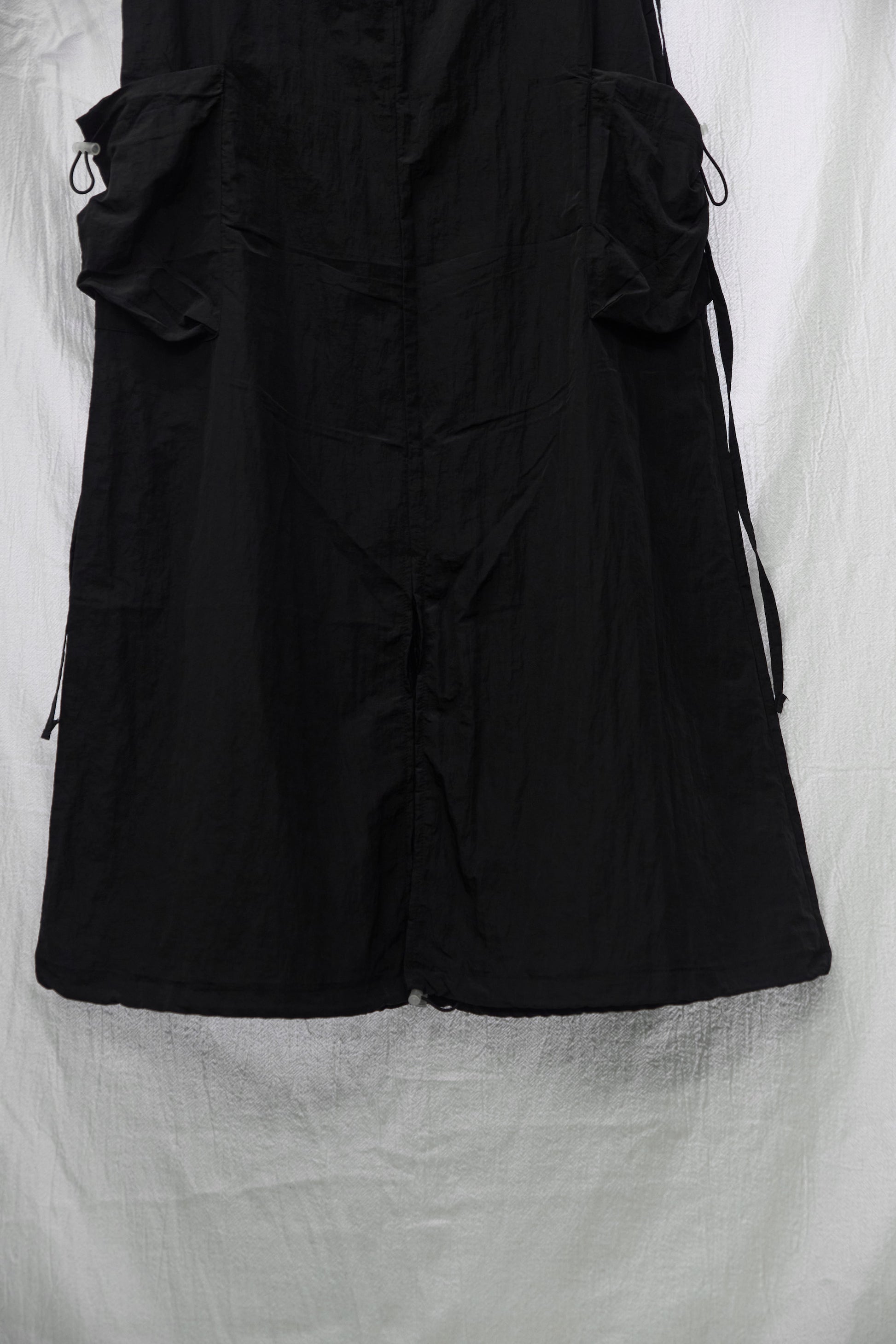 A clean foundation with utilitarian charm. This lightweight slip dress is crafted from crisp fabric with a soft A-line silhouette and adjustable waist tie. Functional flap pockets with toggle drawstrings at the sides add subtle structure, while slim shoulder straps and a minimal neckline keep the overall look refined and effortless.