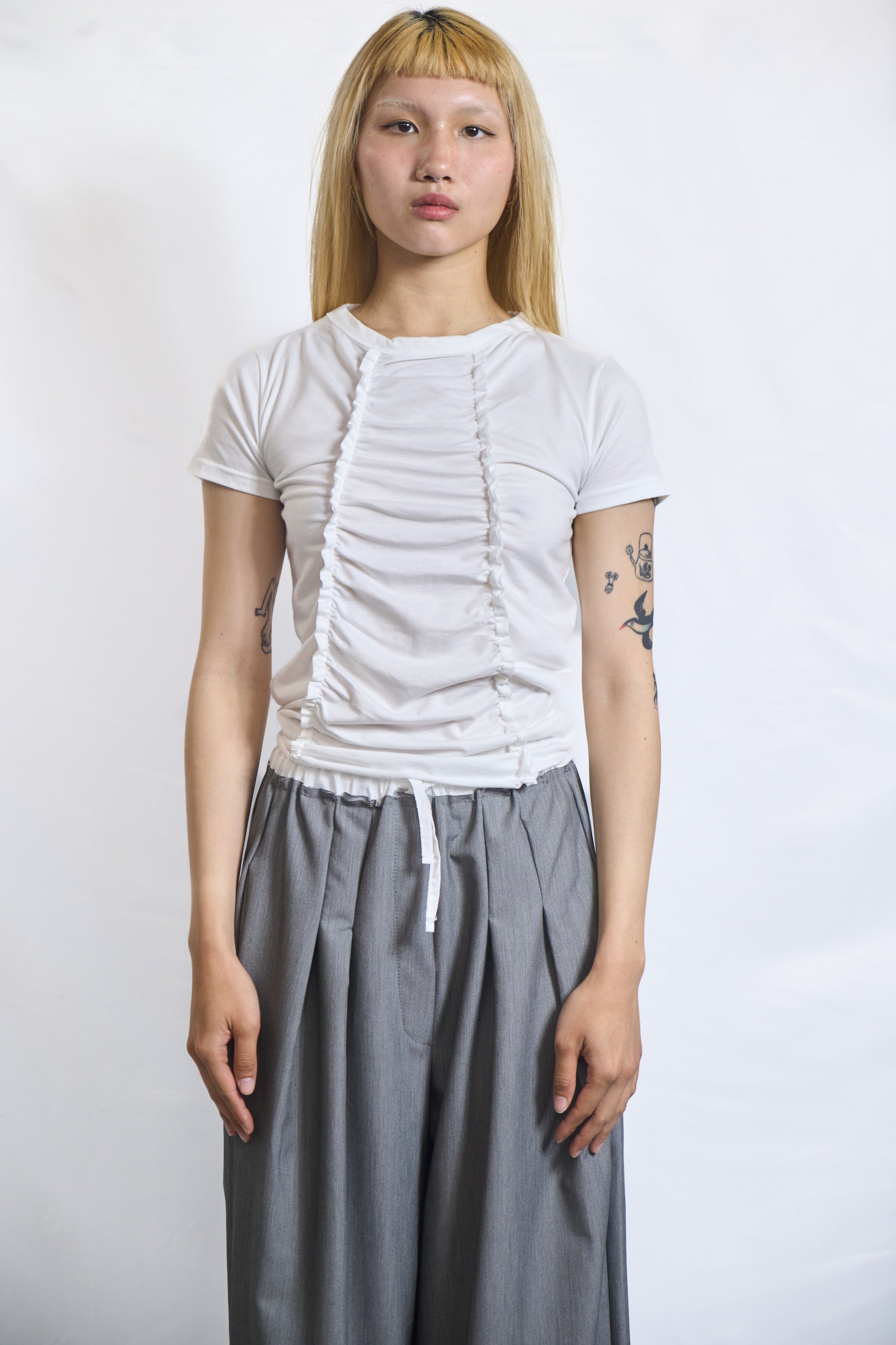 A simple staple with a twist. This short-sleeve tee features gathered ruching along the front and back, creating a structured yet fluid shape. Perfect for adding a touch of texture to your everyday look.