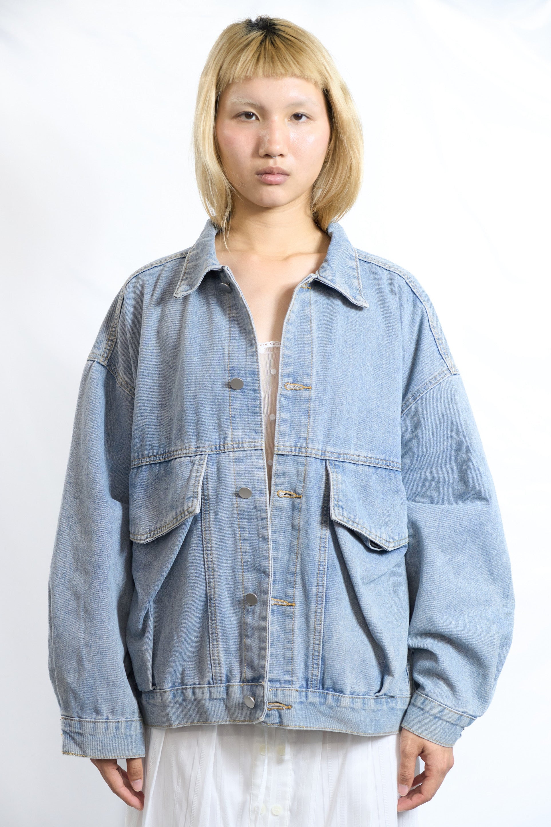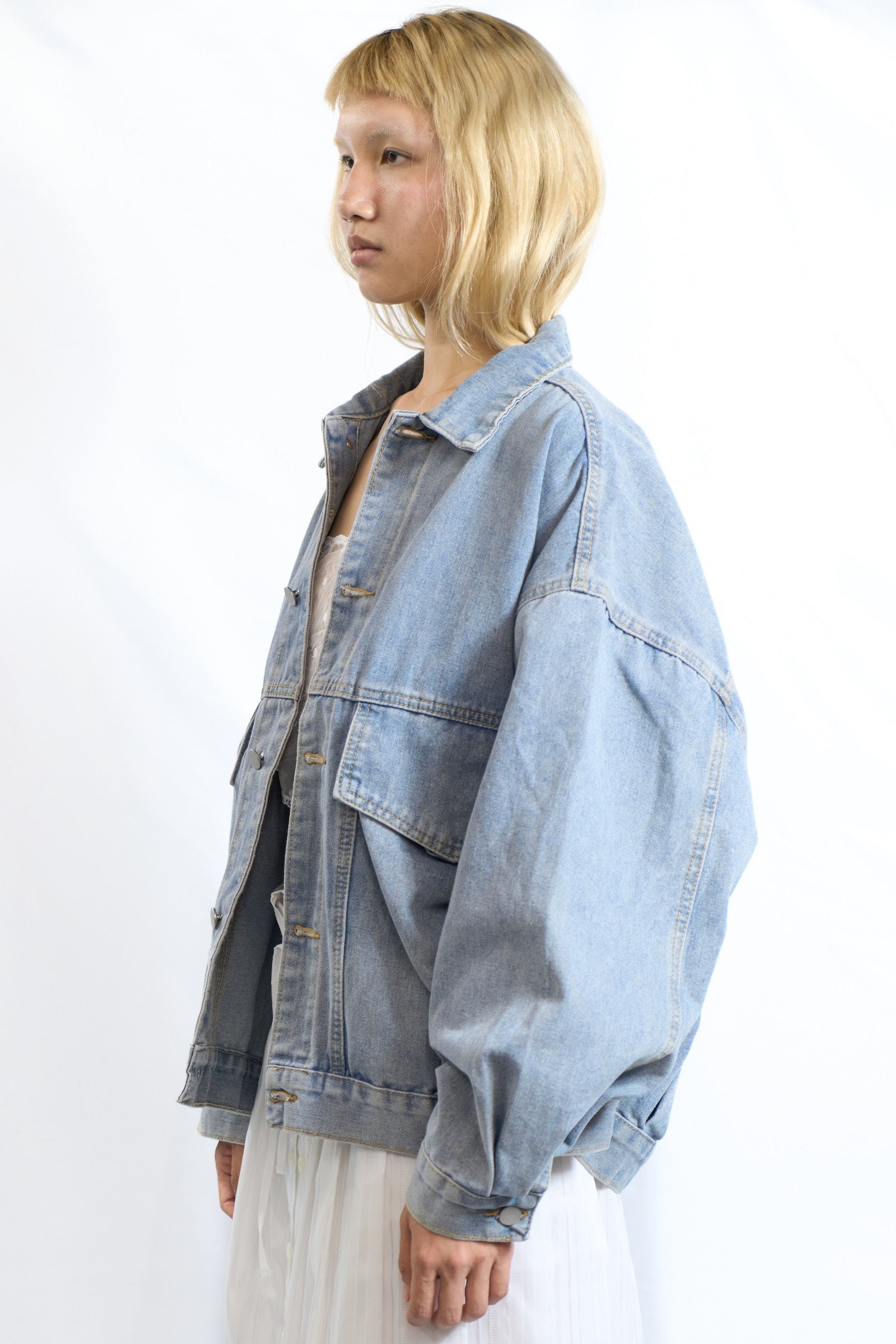 Cut from washed cotton denim, this jacket features exaggerated sleeves, dropped shoulders, and gathered detailing under the flap pockets for a gentle puffed shape. Its lived-in feel and oversized proportions make it ideal for layering over anything.