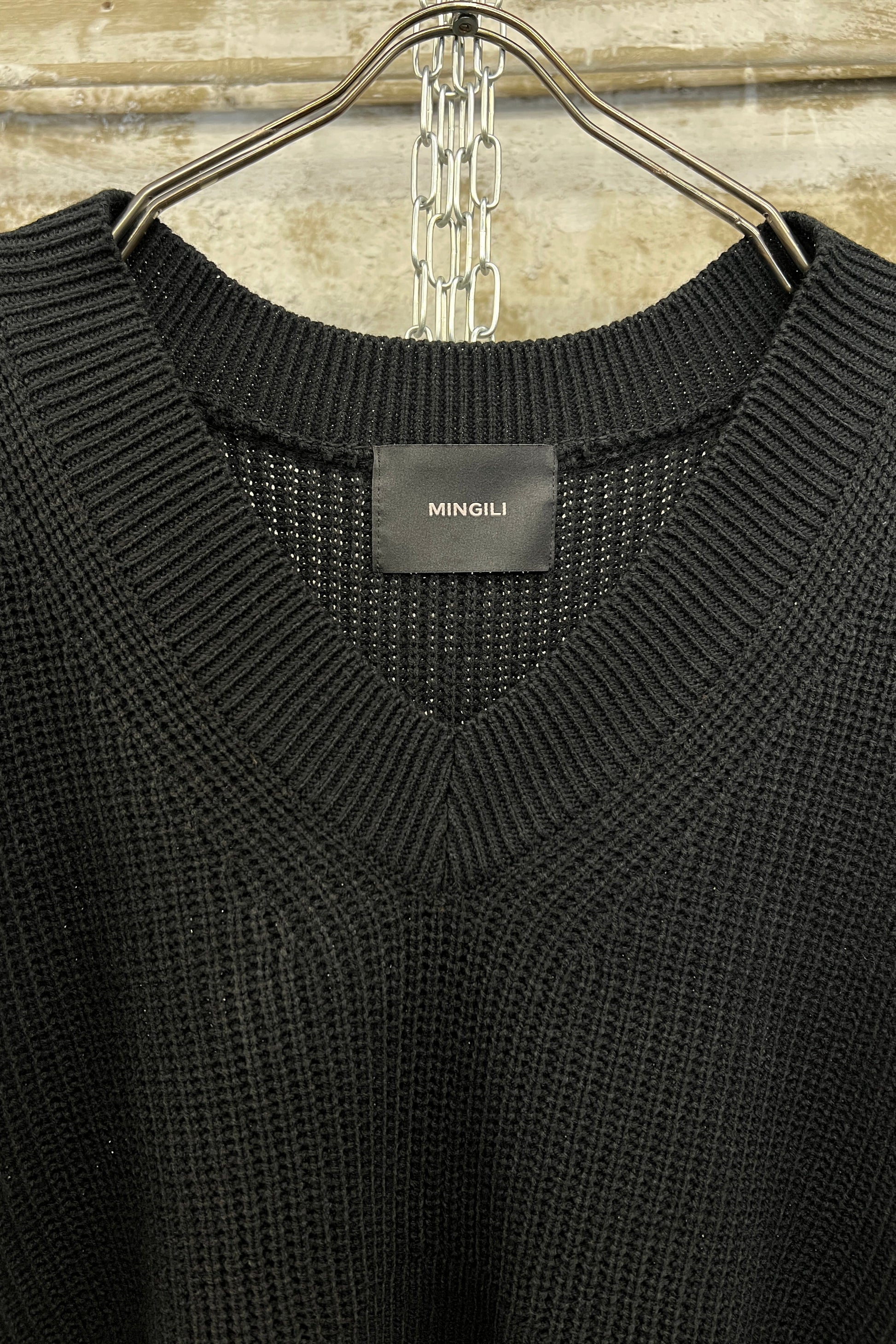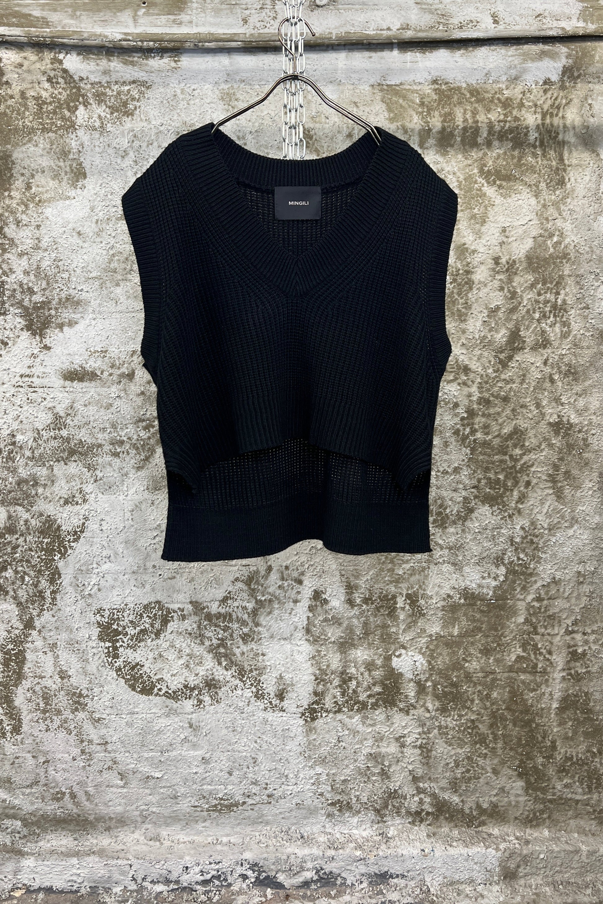A timeless essential reimagined with contrast and form. This black knit vest features a relaxed fit and distinct front-back texture difference—subtle yet striking, ideal for layering in transitional seasons.