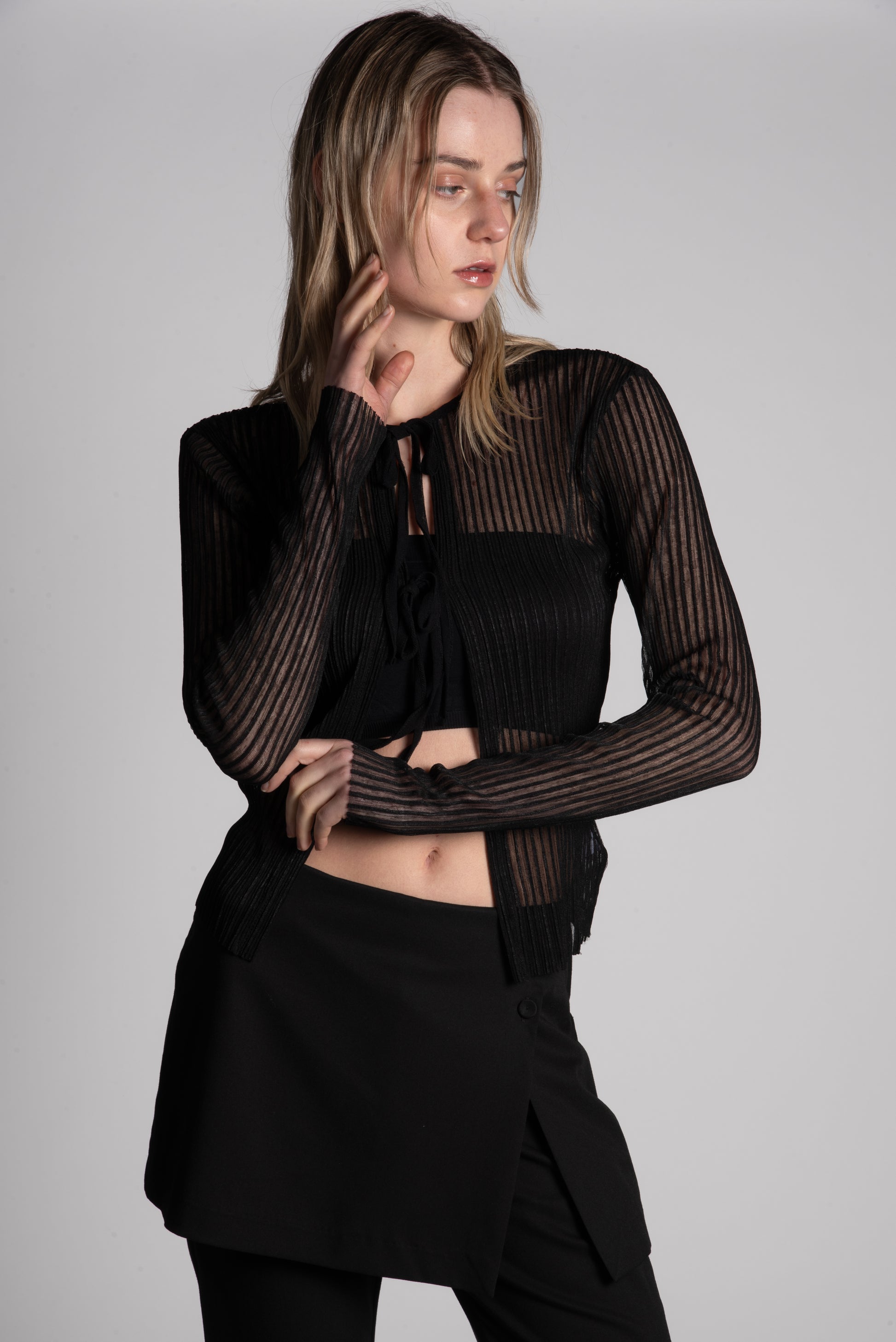 A lightweight, ethereal layering piece featuring a delicate tie-front closure. This cardigan is designed with a sheer finish that adds a soft, textured layer to any outfit without adding bulk.