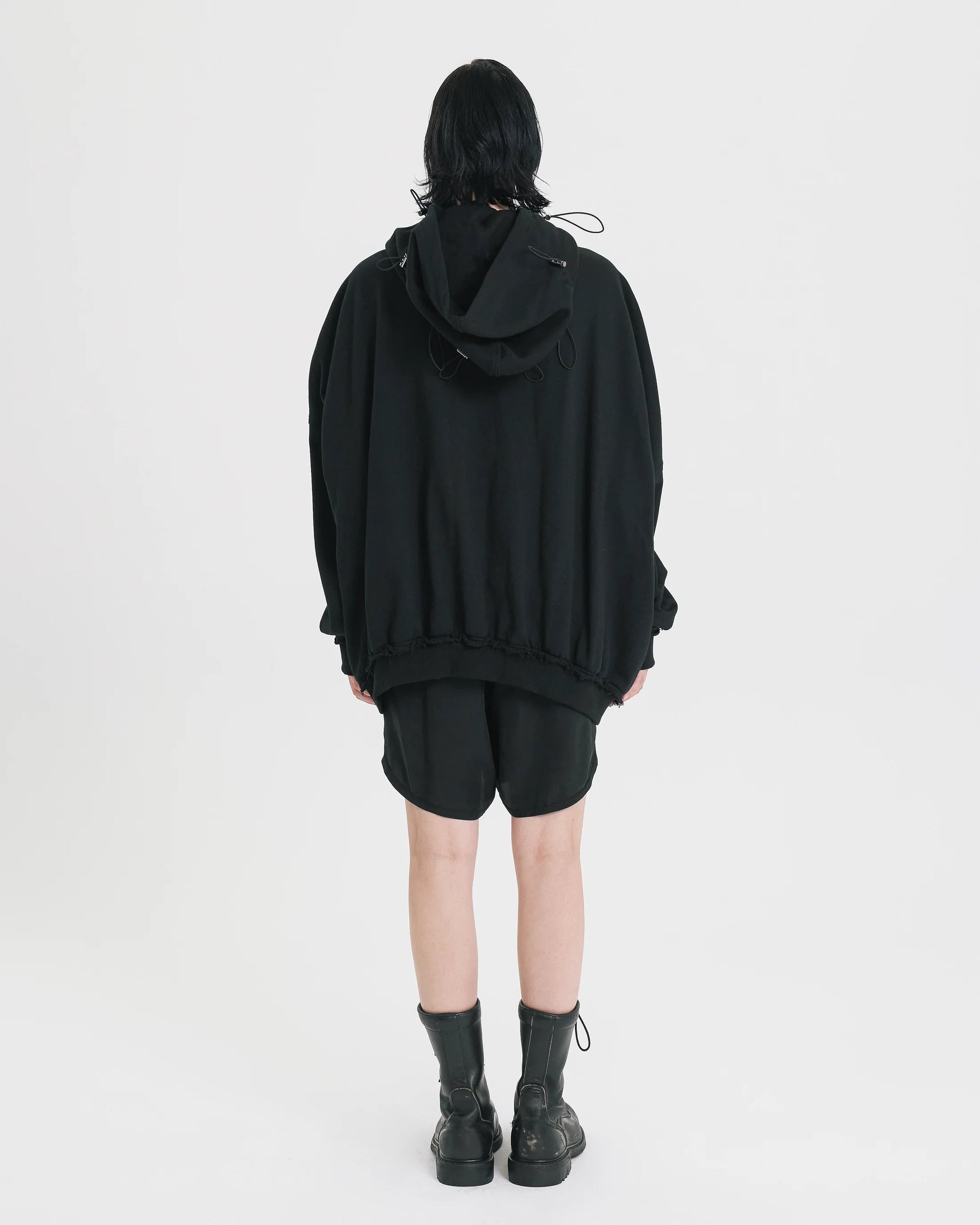 Multi-shoulder volume hoodie featuring an oversized fit, rough-cut hem, and kangaroo pocket with snap buttons, along with multiple strings equipped with cord locks around the shoulders for versatile styling options