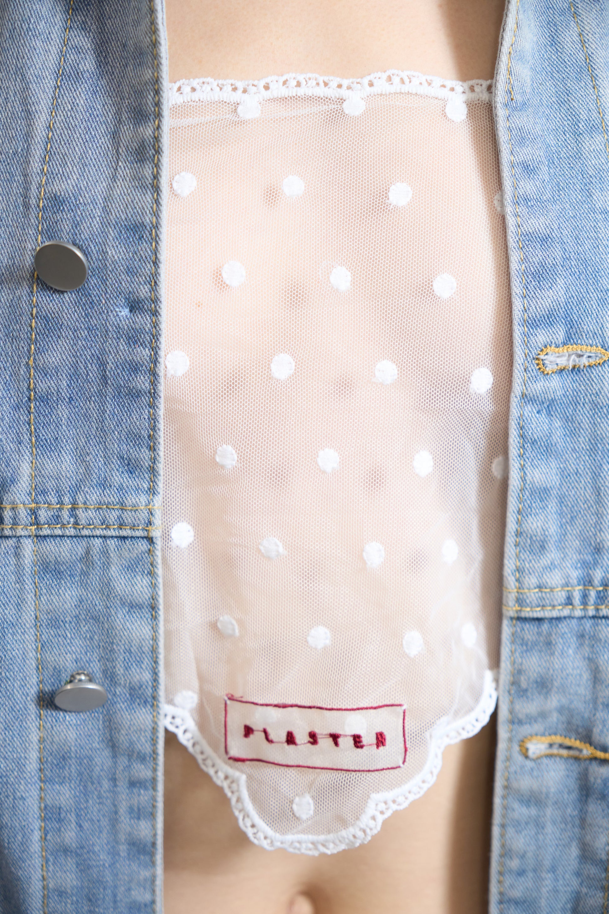 A sheer mesh scarf featuring delicate dot embroidery and scalloped lace edges. The triangular panel ties at the back and is finished with a PLASTER logo embroidery for a subtle signature touch. Versatile in styling—wear it as a top layer, a headscarf, or even as a waist belt.