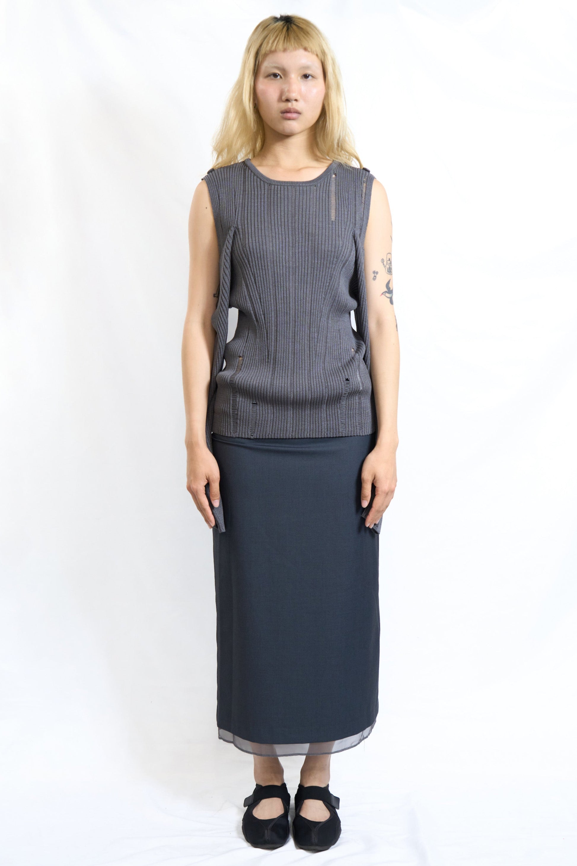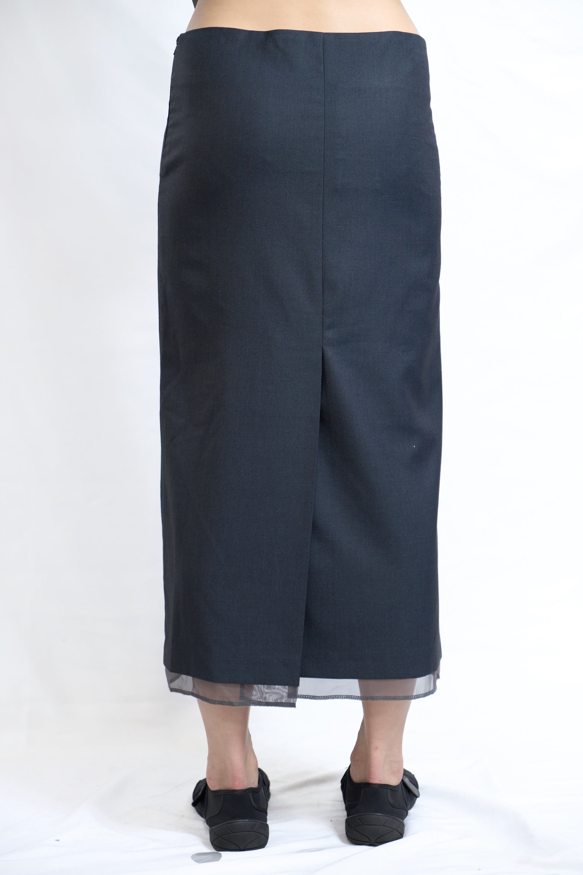 A clean-cut straight skirt with a hidden twist—its hem is finished with a subtle sheer underlayer that peeks through with movement. The tailored silhouette and muted charcoal tone keep it minimal and versatile, while the transparent detail adds depth and softness to an otherwise structured look.