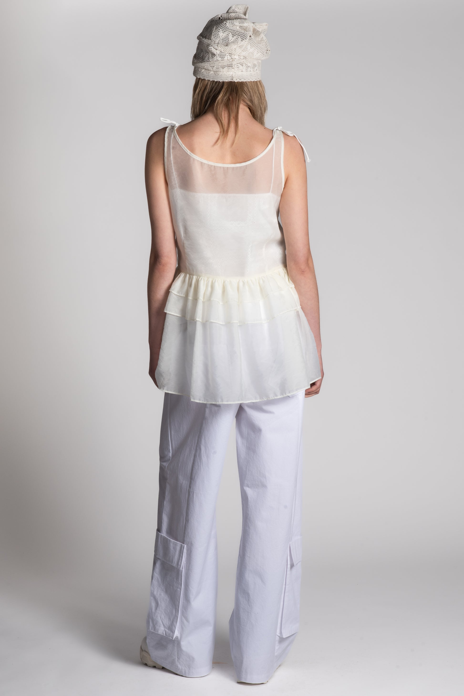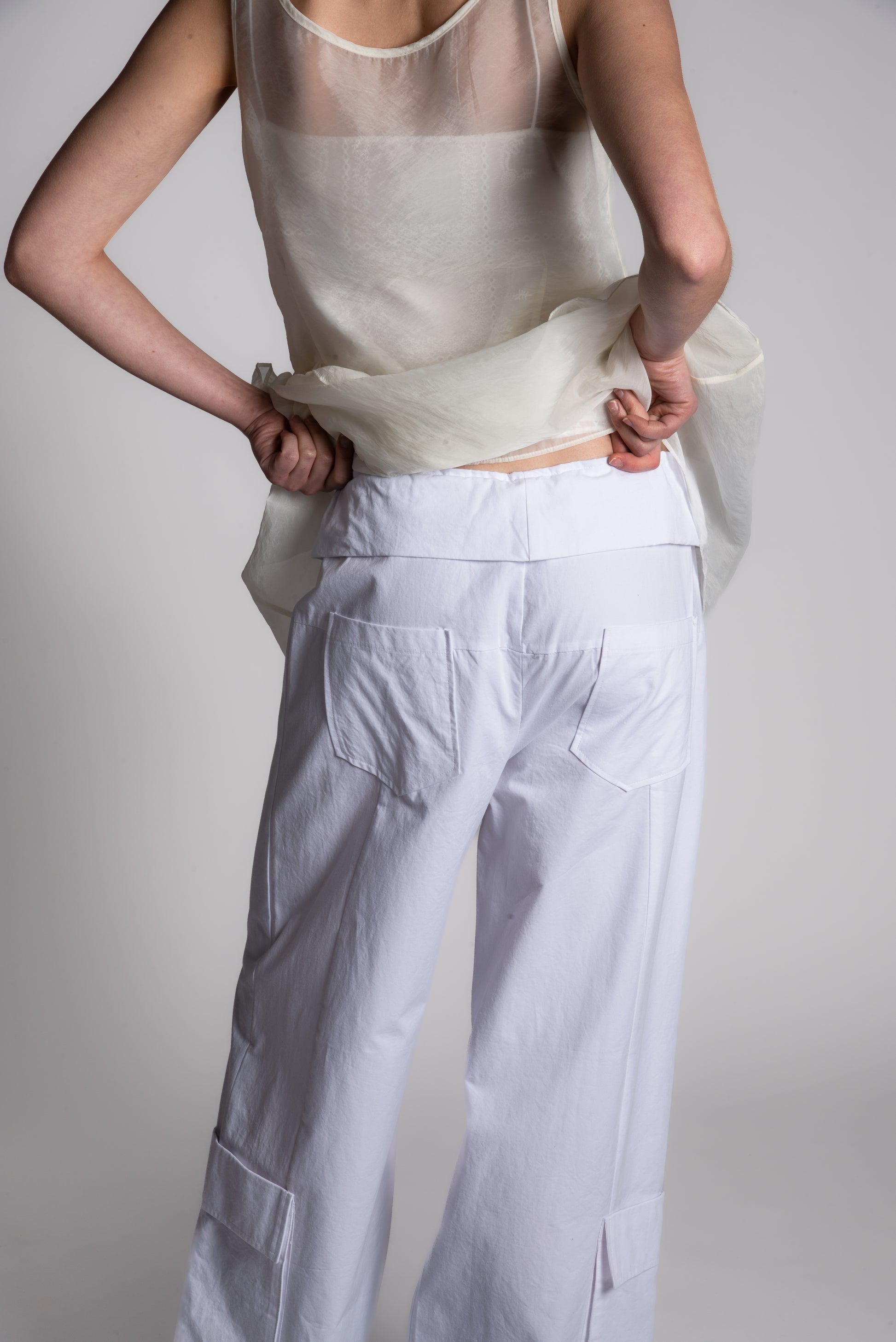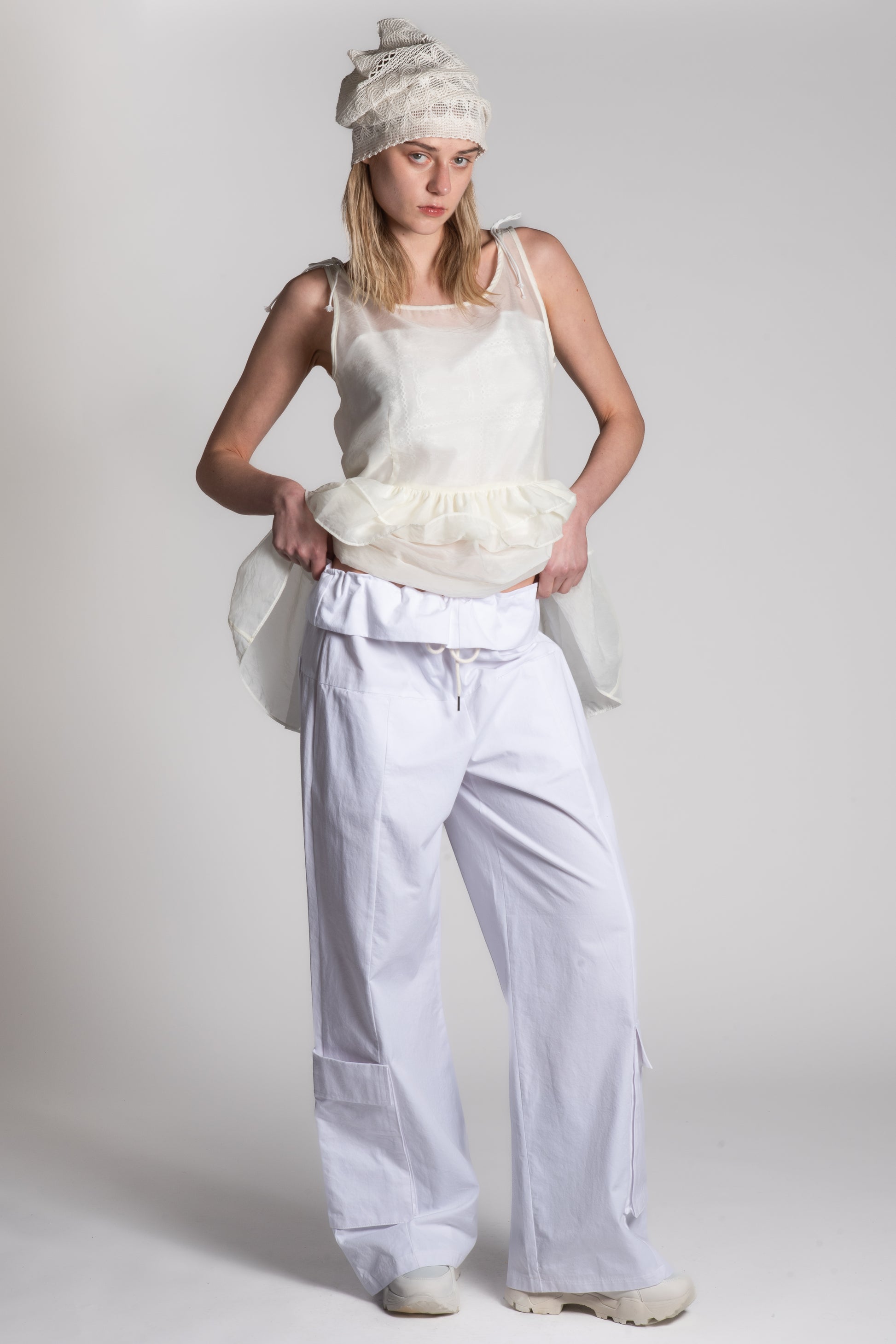 The WHITE COTTON PANTS reinterpret volume and form through architectural construction.